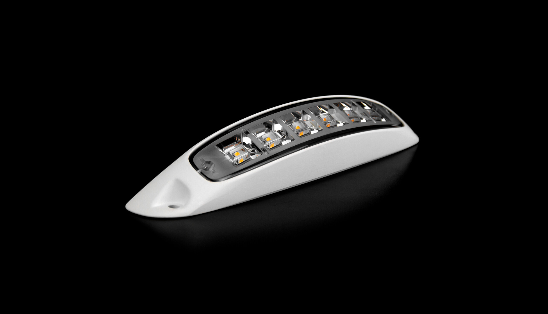 Streamlined exterior Scene Light with curved design to maximise coverage, ECE R10 & CISPR 25, 6x LEDs, clear lens, black or white housing, 1730lm output, 42 degree mount, 12~24VDC. Available in white.